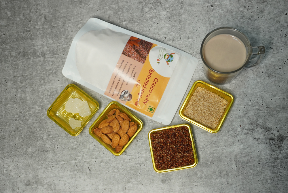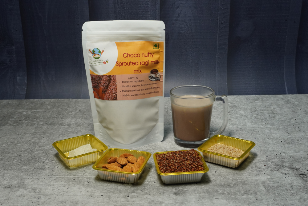 Free from artificial additives, Choco nutty sprouted ragi milk mix is best suited for kids and women, others can have it too.
