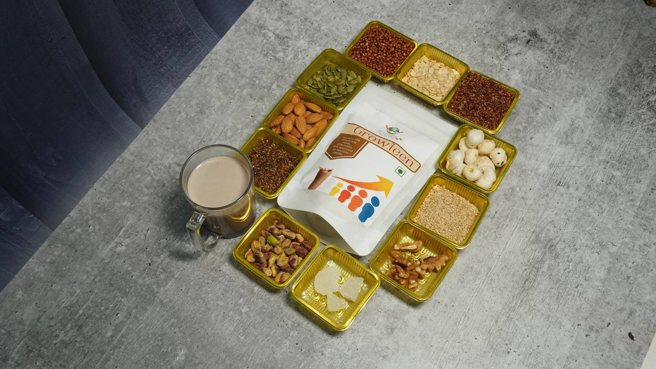 Fuel your child’s growth with growteen Milk Mix, a carefully crafted blend designed for pre-teens and teens. Made with 70% premium nuts and seeds and 30% cocoa powder, unprocessed mishri, and sprouted bajra, this nutritious mix is packed with essential vitamins, minerals, and antioxidants to support overall development.